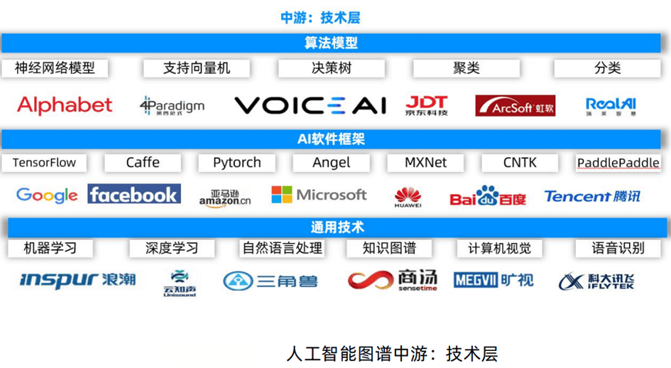 技术层是AI产业发展的核心,包括通用技术、AI技术框架以及算法模型等。这一层级依托于海量数据的挖掘处理与机器学习建模,来进行各种应用技术的开发,从而解决实践中的具体类别问题。计算机视觉、自然语言处理、语音识别、机器学习、深度学习、知识图谱为这一层级的代表性技术。优势企业如谷歌、亚马逊、Facebook加快部署机器学习、深度学习底层平台,建立产业事实标准。