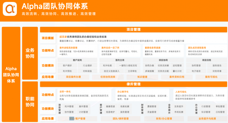 知识管理是Alpha系统的另一大亮点。系统内置了海量权威法律数据库,包括独家版权的司法观点库、类案同判库、优案评析库,还收录了超过1.81 亿份裁判文书与560万+条法律法规,能帮助律师快速获取最新司法动态与法规变化,为案件处理提供坚实的数据支撑。同时,系统整合了百余家优秀律师团队的实战经验,提炼出覆盖民事诉讼、商事诉讼、刑事辩护等18大领域的标准化项目模板;搭配便捷的文档分类与共享功能,律所积累的文书模板、经典案例等知识资源可实现高效存储与复用。这不仅能帮助年轻律师快速提升业务能力与工作效率,更推动了律所内部的知识传承,为长期发展筑牢根基。